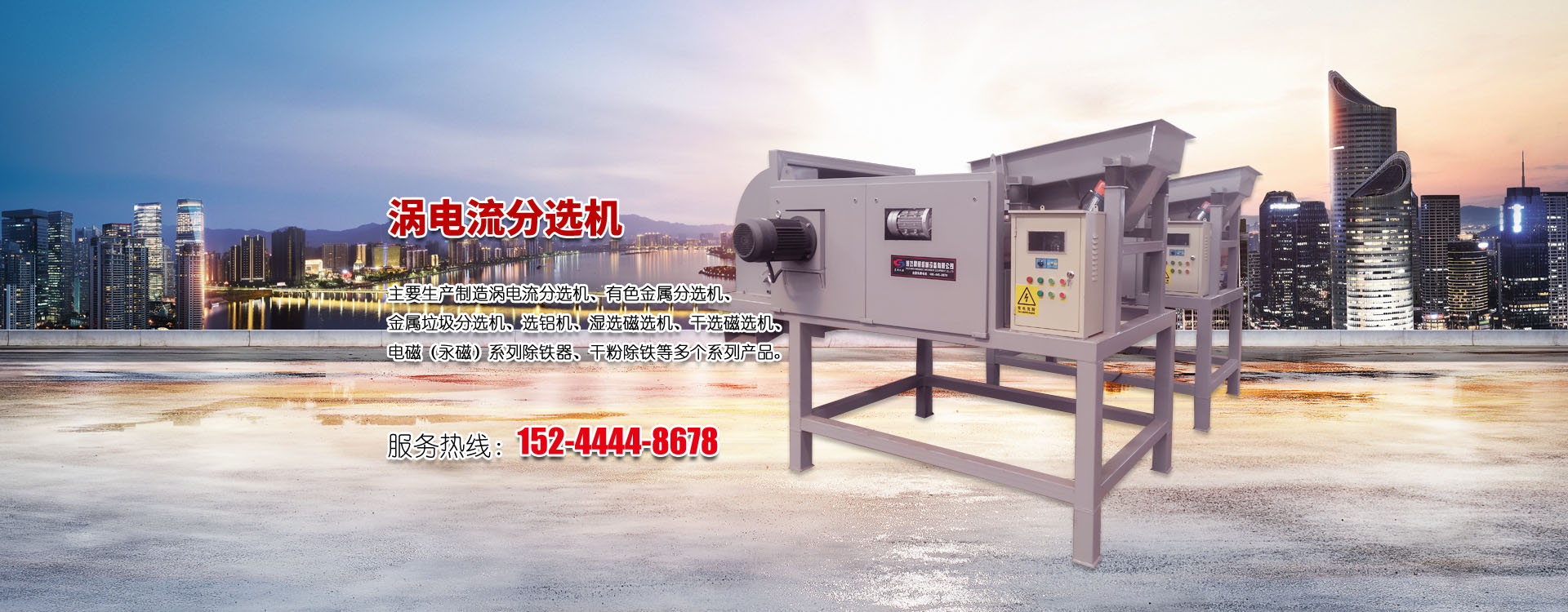 主要生产制造涡电流分选机、有色金属分选机、金属垃圾分选机、选铝机、湿选磁选机、干选磁选机、电磁(永磁)系列除铁器、干粉除铁等多个系列产品。